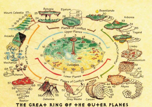 Once again, I find myself investigating the cosmological background of the setting I’ve most recently created.  I was reading through the Dungeon Master’s Guide again, reading the section on planes near the beginning, and I’m in that usual place: somewhere between excited and miffed.  Fortunately, it’s easy enough to change the things that haven’t excited me.