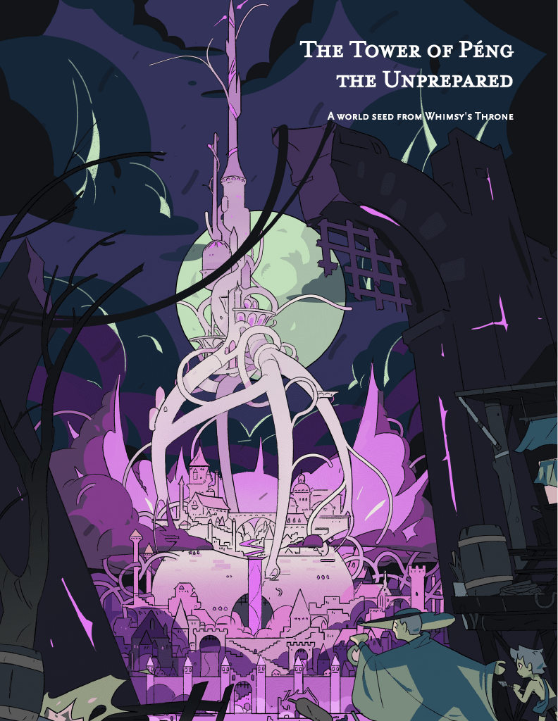 I’ve started a Patreon for the Locations that keep coming to me! You can find it here, at Whimsy’s Throne. There’s a free version of my first finished World Seed there, The Tower of Péng the Unprepared. Here’s the cover art, from my friend Worsey.
